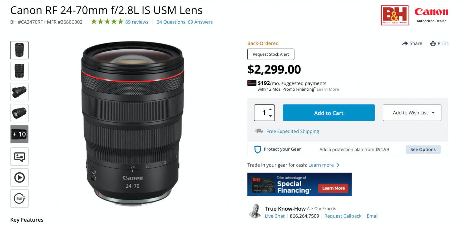 Right now, a lot people are purchasing lenses for their mirrorless bodies to replace the lenses that they previously had on their DSLR. B&H sells lenses like the Canon 24-70mm F/2.8, but it’s for a DSLR and not for a mirrorless body.